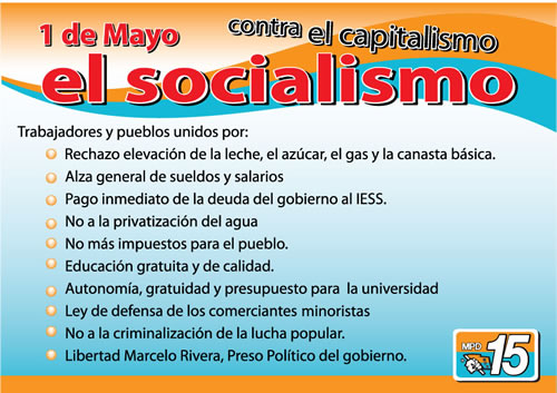 Luis Villacis National MPD Director, invites all employees, students, peasants, workers, housewives to make this May 1st a day of unity and struggle against the arrogance of the executive, the anti-worker policies, against the high cost of living and the deaf ears of Correa, who tries to mask the reality based on false national speeches he called “Citizens’ Revolution.”