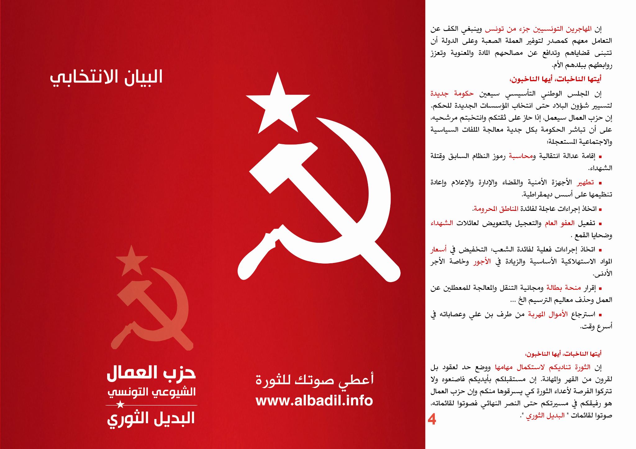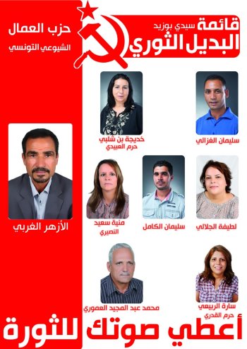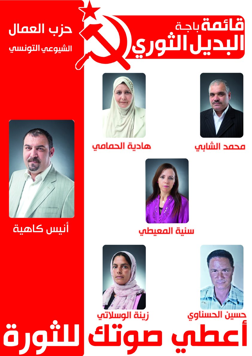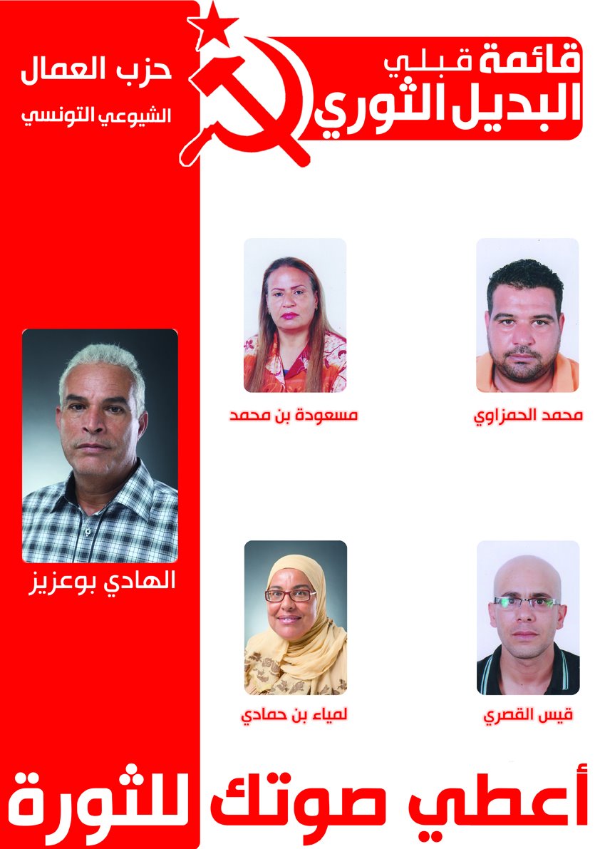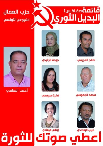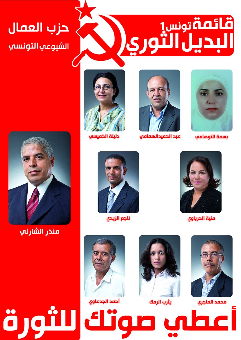 The Workers Party, which has struggled since its inception in 1986 for the people to have a free and democratic Tunisia and participated in the overthrow of Ben Ali and continues to struggle to complete the tasks of the revolution, leads you in this carrying along with this name the name of ‘The Revolutionary Alternative’ and as its logo the hammer (the symbol of Worker) and sickle (the symbol of the Farmer).