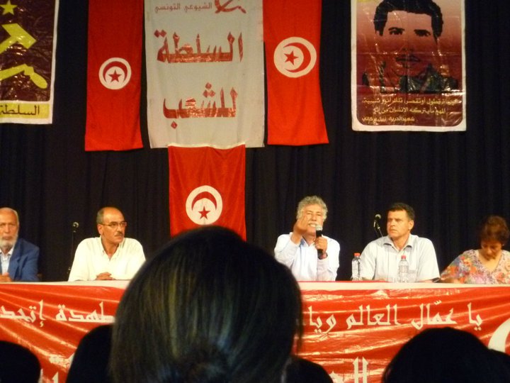 The Tunisian Communist Workers Party (PCOT) has been covered on this blog before as well as its party congress which took place this weekend. During one of the sessions, the party’s leaders (Hamma Hammami and others) considered changing the party’s name to leave out الشيوعي ”Communist”. Various Tunisian commentators have noted that while the party has a strong core and enjoys relatively strong credibility with certain parts of the public the PCOT nevertheless suffers from its identification with communism. Many Tunisians associate communism with obsolescence, authoritarianism and atheism; the last problem is particularly relevant in that it exposes the party to particular attacks when faced with other parties coming from the Islamist tendency and other leftist parties not identified with the same label who are not seen as being hostile to religion. Tunisian news reports noted that the issue came up on the second day of the congress and that no decision was reached as to whether or not to change the party’s name. From Business News: