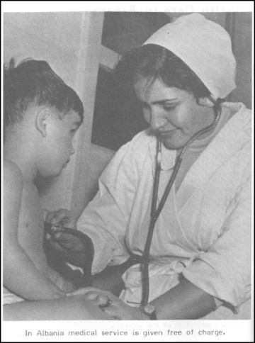 In the People’s Socialist Republic of Albania medical service is given free of charge. This includes hospitalization, office visits, analyses, treatments, home visits by the doctor, etc. Albania has undertaken this humane task and has spared nothing to ensure for the people total coverage by a qualified medical service established on a scientific basis. Treatment of patients and the distribution of medicines are under no financial restrictions whatsoever. Physicians place the care and cure of the patient above any question of cost involved.