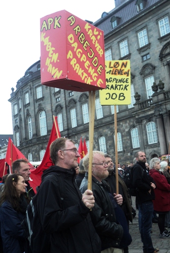 [10] On the “smaller side” of the red sign it says “APK Copenhagen”, on the “larger side” it says what also stands under the picture. On the yellow sign it says “A wage to live by – Unemployment benefits – Traineeships – Job”