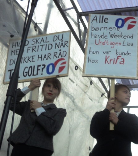 [15] An ironic group called “0F”, the name is a parody on “3F”, a Danish trade union. The left sign on the lower picture says “What do you need leisure for, when you cannot afford golfing?”
