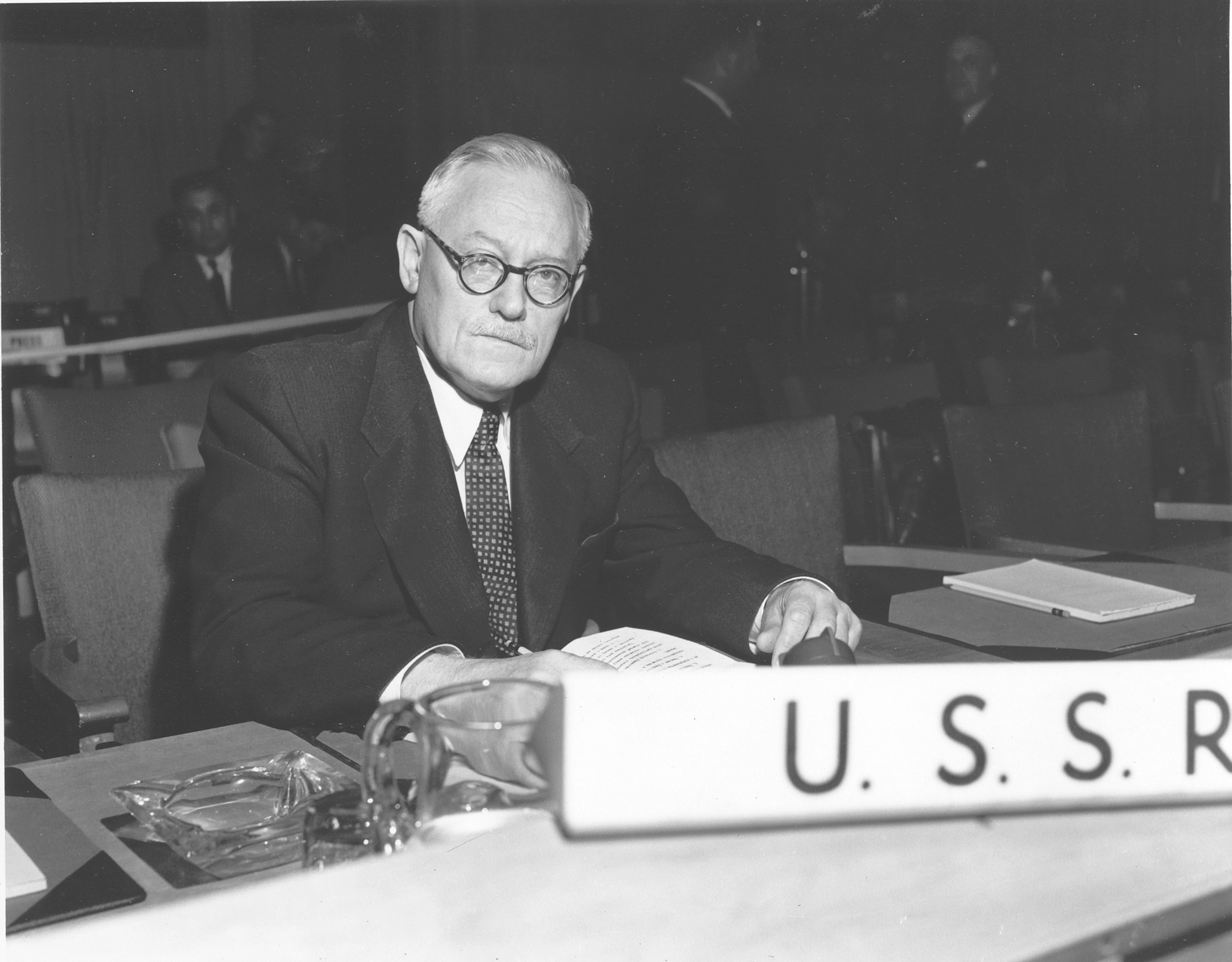 We had gathered in one of the rooms of the palace, where we were staying, waiting for Vyshinsky. At last he came. I was excited because I was meeting him for the first time. (When I went to Moscow in July 1947, Vyshinsky was not in the Soviet Union.) He was just as I had heard, a vigorous man, not very tall, with horn-rimmed glasses and bright black eyes that took in everything. He was wearing a blue suit. Vyshinsky shook hands with all of us in turn and when he came to me, apparently as I was the only one he had not met before, he guessed who I was, because he gave me his hand and asked me in Russian:
