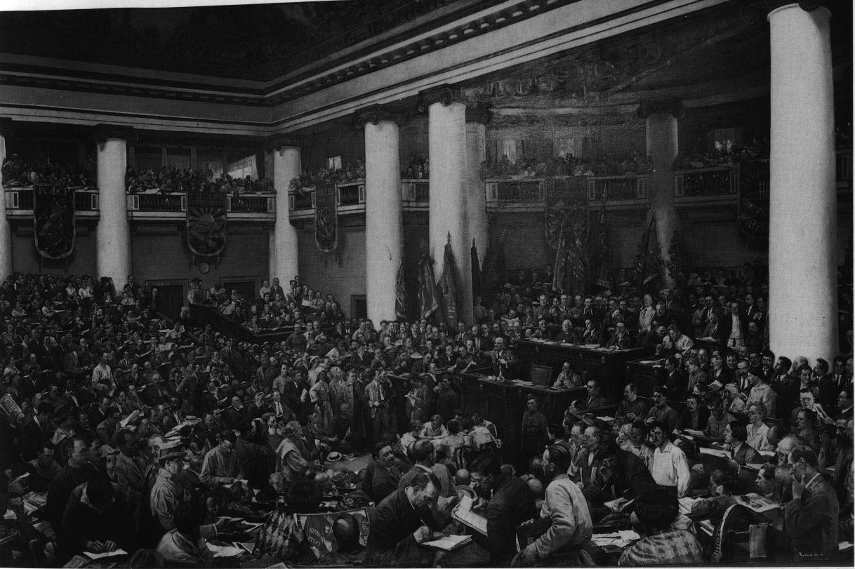Thereafter an immense painting “The Ceremonial Opening of the Second Congress of the Third International” [350×550 cm] was shown in 1924. Of the 218 delegates from 67 parties, Brodski made 125 portraits, combining these into the picutre. Each individual delegate – including Trotsky, Zinoviev, Kamenev and Bukharin – are recognisable.