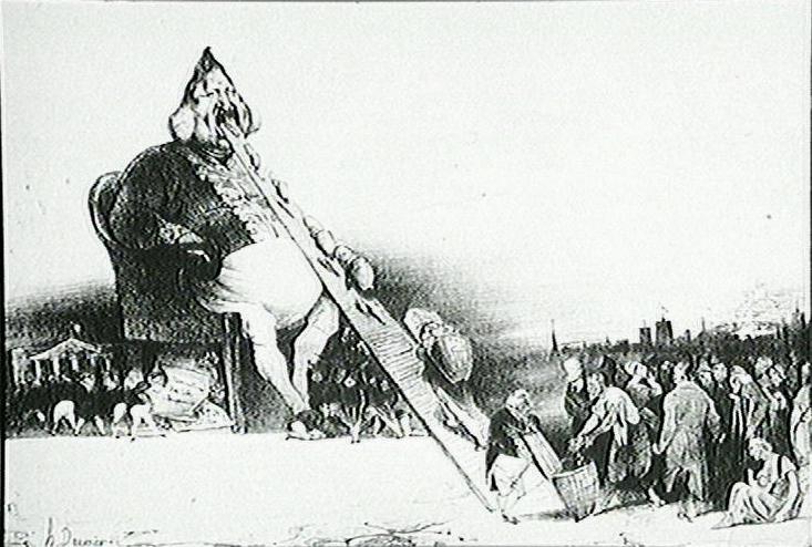A master of this was Honore Daumier, who here, lampooned the King of France as never-endingly receiving into his vast mouth the people’s wealth: