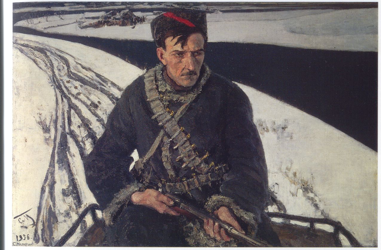 The image of “A Partisan” by Sergei V Malyutin 1936 [100×150 cm] is deceptively simple. With intense focus on the man, the rutted snow behind shows how this man will travel on guard for danger.