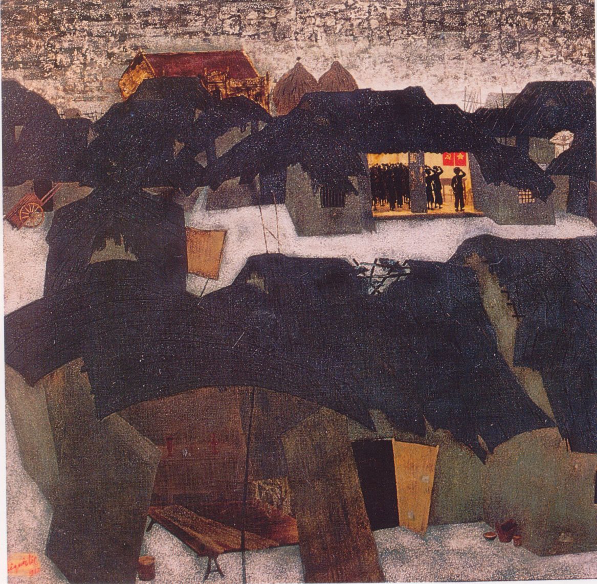 Even some of the abstractionist elements during this period, are sometimes very powerful. Such as for example “From Darkness (1982) by Le Quoc Loc (1918-1987) [Plate 12] (p.102). Surrounding blocks of black and gold shapes of lacquer, depict houses in the night. In one off-centre house, placed high on the wood surface, a gold and red light brightly lights a central room. The red light is the hammer and sickle on one flag, with a second flag composed of a gold five-pointed star on a red background. In front of them are black silhouettes of men and women workers saluting the flag.