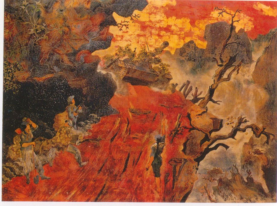 Le Tri Duong (1949) painted “Breaking Through a Key Point” showing a tank with its barrel aiming at the skies, bursting through a blockade onto a red road, being hailed by 4 guerillas – three women and a man. The red lacquered road and the gold lacquered background are again symbolic. [Plate 19].
