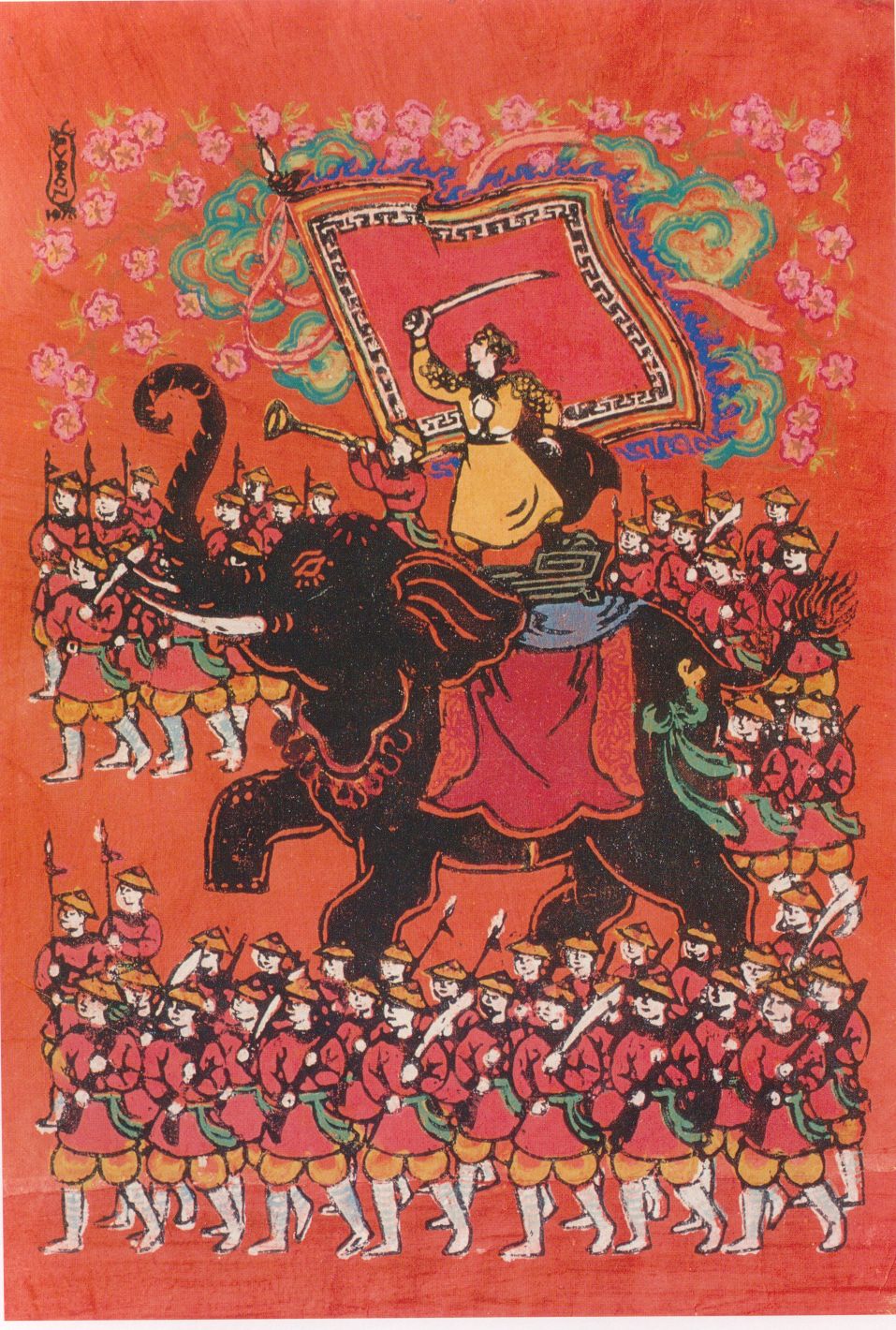 This article will not discuss poster art in any detail. But an interesting historical comparison of the wood cut in Plate 3, shows again how the modern Vietnamese artist harked back to her/his heritage at a number of points. The wood cuts continue the famous Da Hong village traditions. They both depict episodes from earlier wars of national liberation, in particular those against the Chinese Han dynasty who occupied Vietnam for many years.