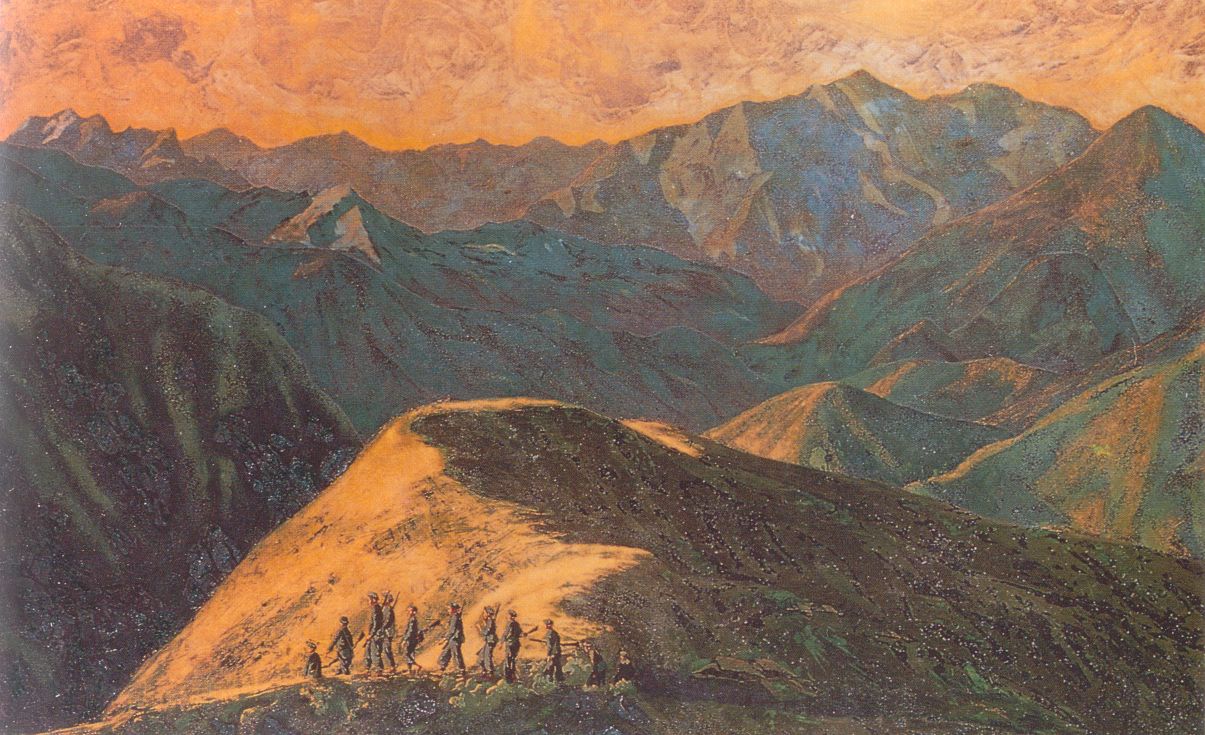 Beautiful sun burnished green mountains form a background to a small troop of soldiers crossing a ridge. Here both content and form are perfectly matched. The ‘everyday’ aspect of a troop of soldiers is part of the scenery.