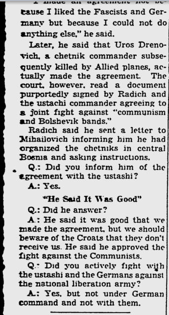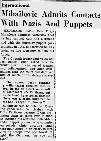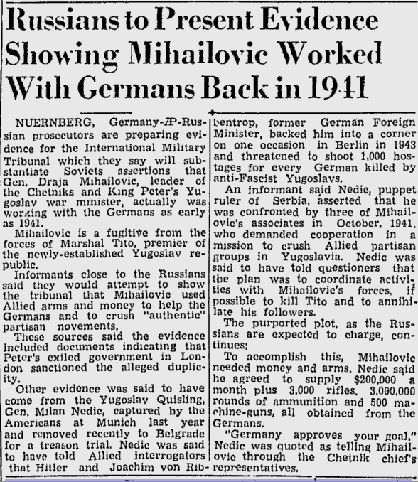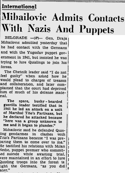“The Serbian chetniks of Draza Mihailovic were represented as fighters against the occupier, while in fact they were the allies of the Nazi fascists in Yugoslavia….The documents in this collection indicate clearly and unequivocally that the Chetniks collaborated with the occupiers, both in the military and political sphere, as well as in the domain of economic activity, intelligence and propaganda…“