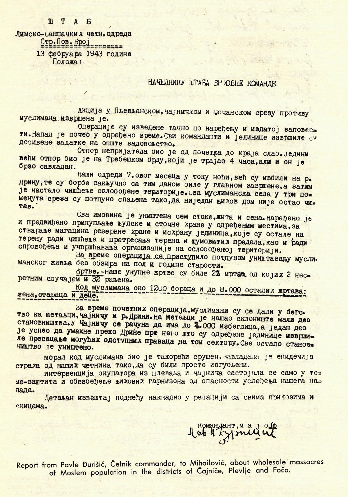 All Moslem villages in three mentioned locations [municipalities of Pljevlje, Cajnice, and Foca] were burned down, and not even one home remained intact…. During military operations, we engaged in total destruction of Moslem population without regard to their sex or age. Our victims include 22 dead, of which 2 by accident, and 32 wounded. We killed about 1,200 Muslim soldiers and about 8,000 of their women, elderly and children.