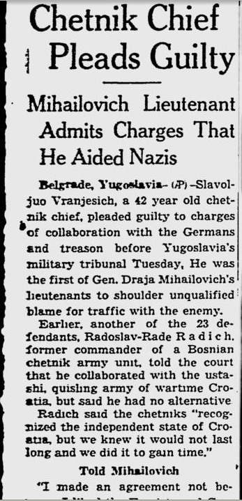 Draža Mihailović, the leader of the Chetniks, was initially an anti-Nazi nationalist but started collaborating with the Axis occupation. He was tried and executed by firing squad by Tito’s government in 1946 for war crimes, high treason, collaboration, ethnic cleansing and genocide.